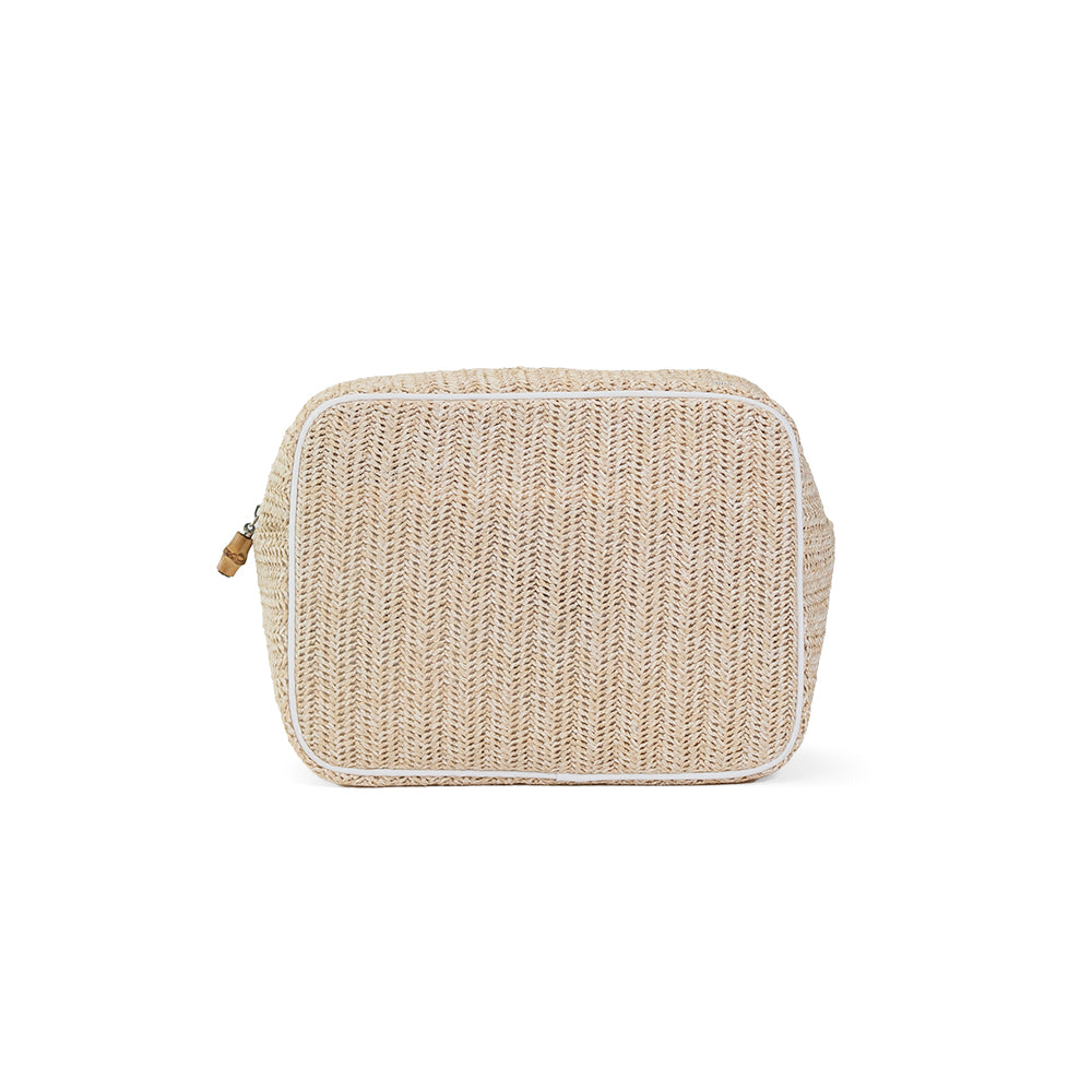 This beautiful straw XL Glam are perfect for makeup, makeup brushes, skincare products, nail polish, jewelry, and any additional accessories. With an open interior and back wall slip pocket this is the perfect catch-all to keep you organized.